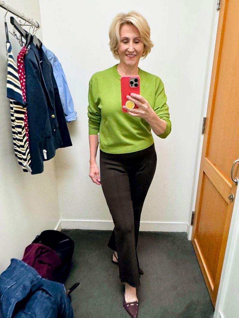 The soft, washed pinks and reds, with a touch of brown, are beautiful and right on trend. But honestly? I don’t love this sweater with these knit pants. Tight sweater, tight pants—it just feels too much, and trying to match the brown in the pants to the brown in the sweater makes it look dated. I think it would be way cuter with medium-wash straight legs or some wide-leg jeans. Live and learn—that’s why we do try-ons.