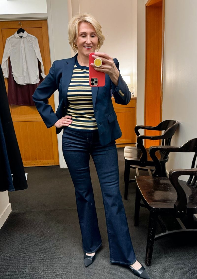 This is the Carolyn Sweater Tee in merino wool, paired with the École blazer in Italian wool, and I’ve got it on with those high-waisted, flared jeans again. It’s definitely a little matchy-matchy with all the navy, but you know what? I kind of like it. It almost has that casual suit vibe going on. And if you swapped the jeans for brown corduroys to complement the brown in the sweater, it would give you a whole different vibe—less preppy, more of that town-and-country chic look I discussed in my Fall style vibes post.
