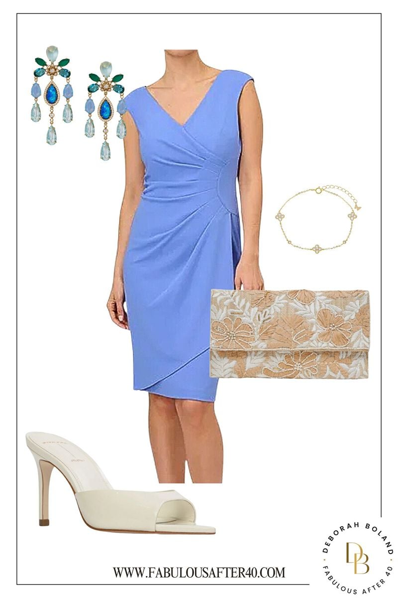 It doesn’t take much to look blooming beautiful in a dress like this! This stunning blue shade, one of the top colors for spring, is both vibrant and elegant. Gorgeous draping across the front adds interest and helps hide a tummy.