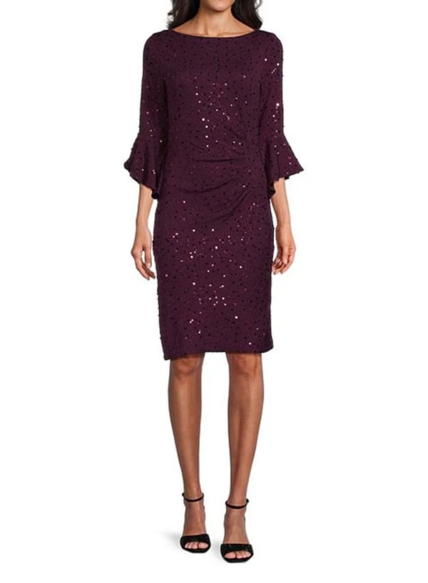 Boat Neck 3/4 Bell Sleeve Pleated Waist Sequin Sheath Dress