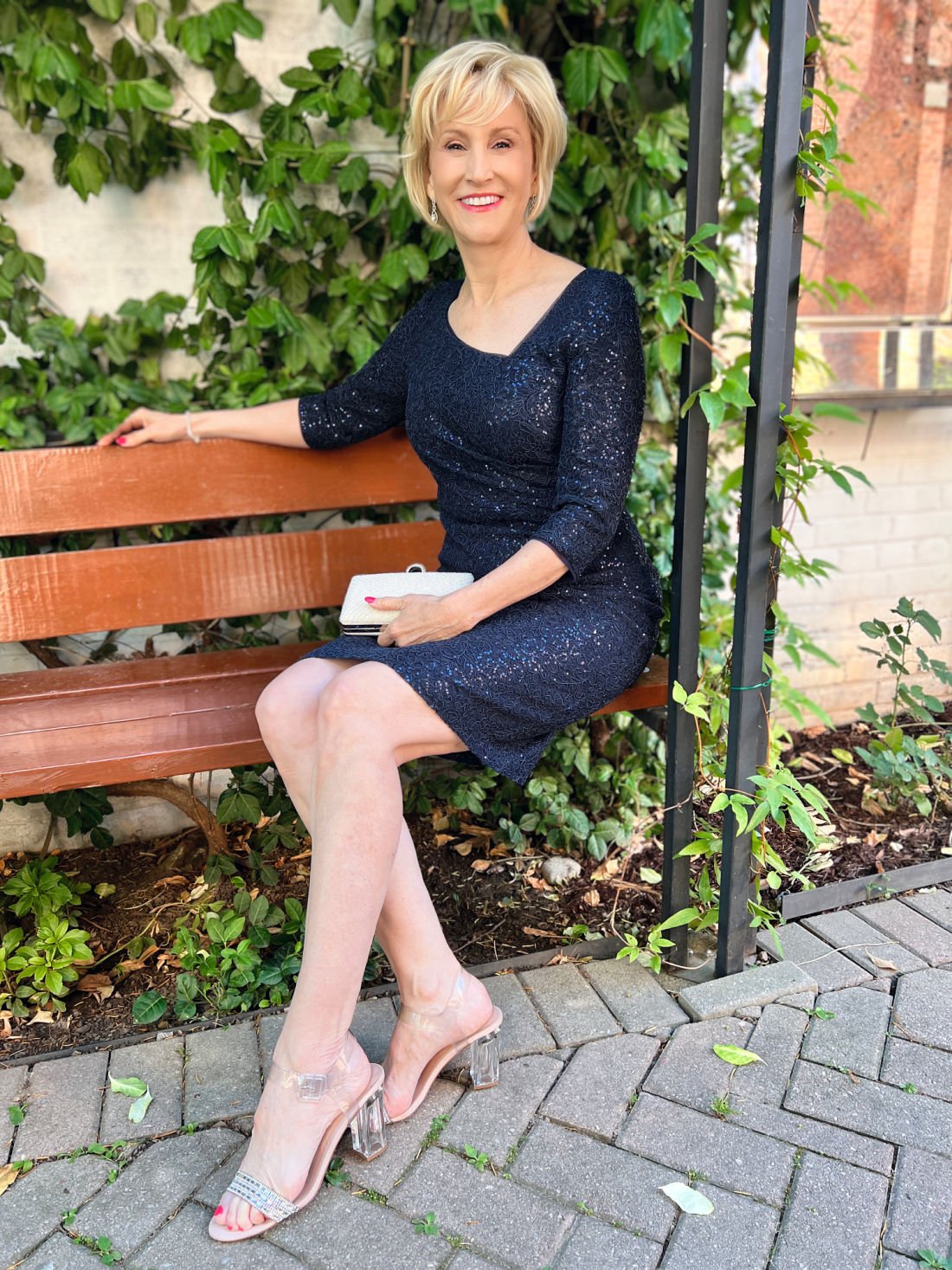 This navy-fitted sheath dress is a striking choice. It is powerful without being intimidating, and its all-over sparkle gives it that wow factor. The dramatic touch is the bold, asymmetrical neckline which makes this chic and modern.