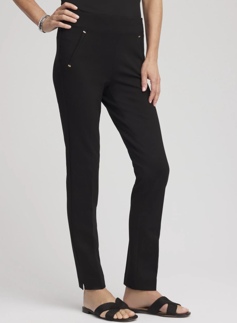 Deborah’s Fix: Upgrade to ponte knit pants or ribbed leggings that hold their shape. These give you comfort without that “gym clothes” look. Pair them with a longer sweater, a short tailored jacket, or a belted cardigan to balance your proportions.