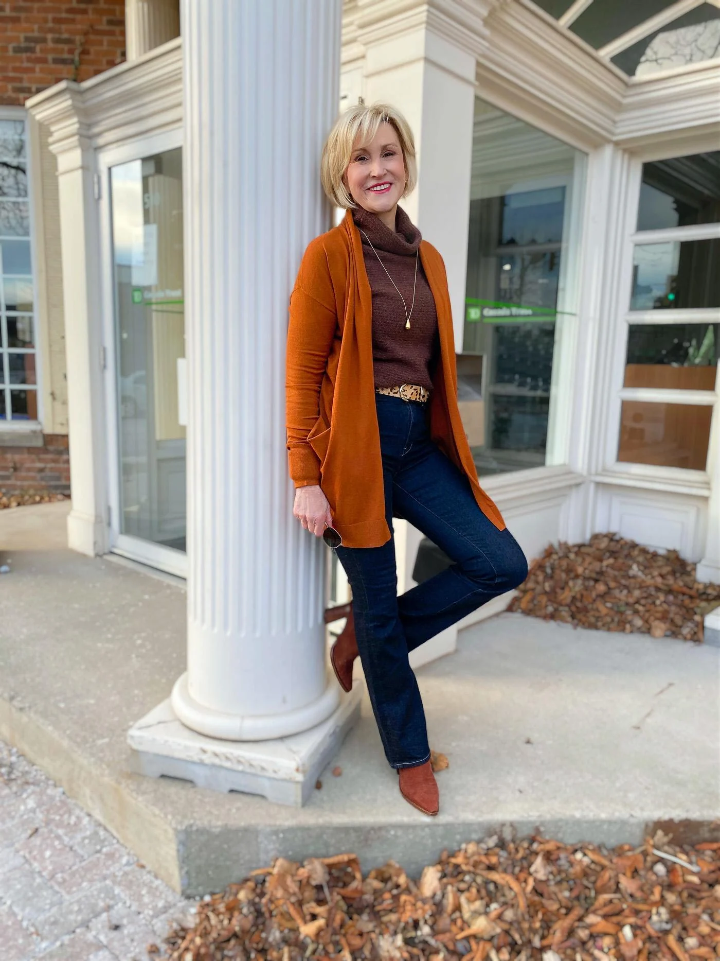 Invest in a coat or jacket with a current cut. For fall 2025, you’ll see tailored trenches, cropped leather jackets, and long, lean wrap coats. Neutral colors like camel or navy will give you the most versatility, but don’t overlook the impact of a rich seasonal color.