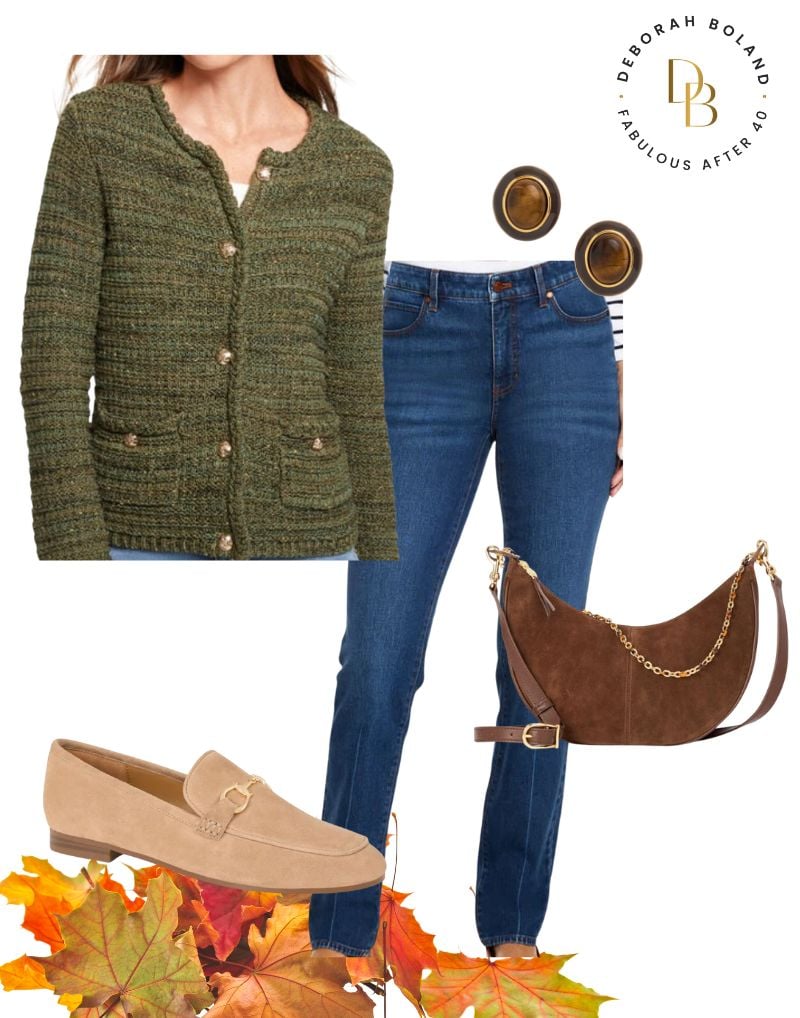green cardigan | jeans | bag | loafers | earrings