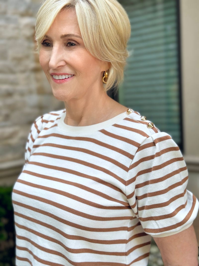 There’s something so fresh about cropped ankle jeans paired with a tan-and-cream striped short-sleeve sweatshirt— especially with sweet details like puff sleeves and tiny buttons at the shoulder.