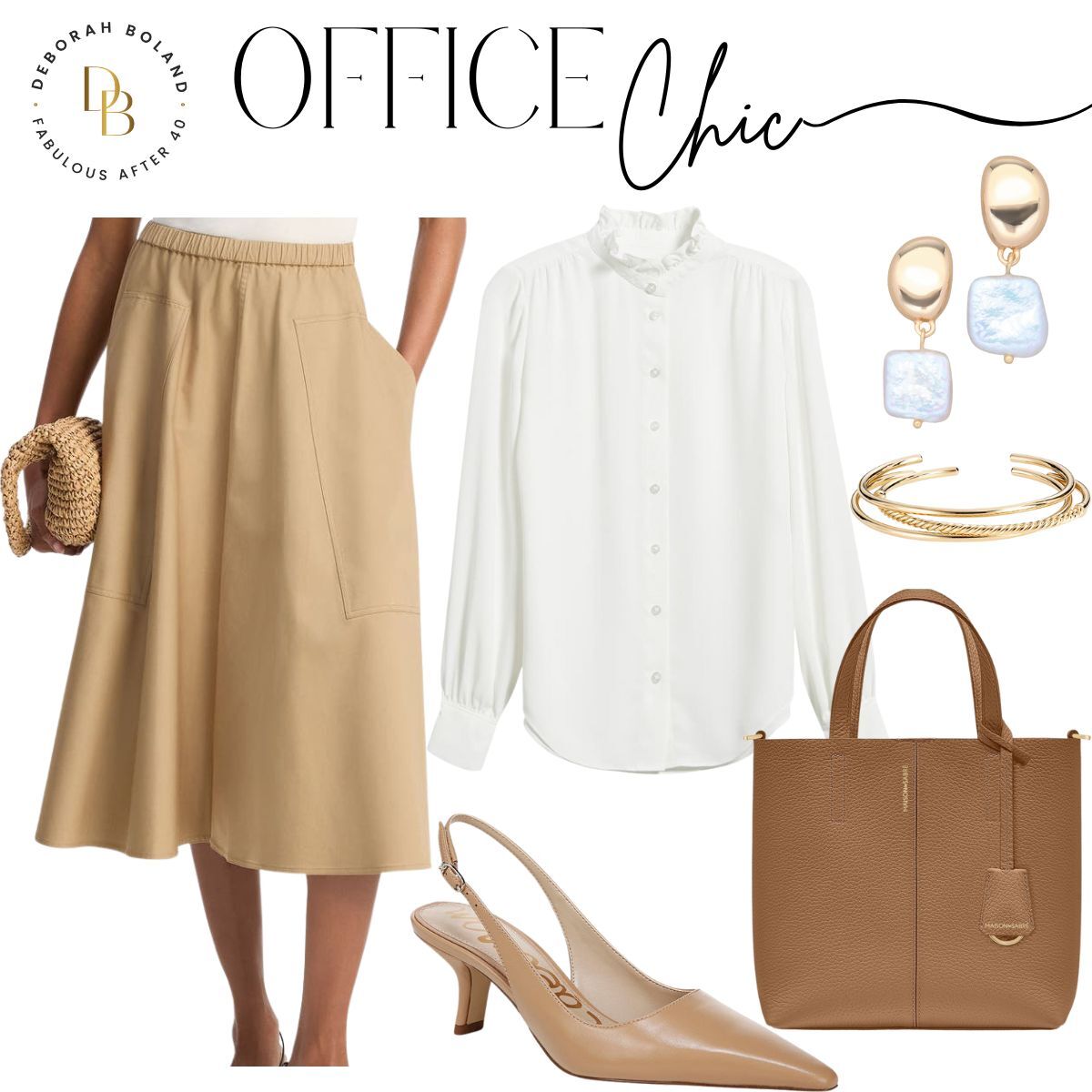 Skirts are one of the most professional items you can wear at work, but not all skirts are created equal, and many are just downright uncomfortable. So why not feel good and look pulled together in this stretch cotton midi skirt by Vince? I’m showing it here in a neutral tan color, which makes it very versatile. Add a ruffle neck blouse, sand slingback heels, a structured leather tote, a set of bracelets and pearl drop earrings, and you have a pretty office look that feels fresh and feminine but is also authoritative.
