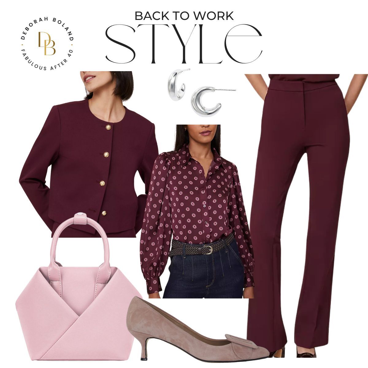 Matched suits are back in style and perfect for women our age who want to wear pants and have an executive look. This rich-looking two-piece suit is seriously chic! I love it with this geometric print blouse. With or without a jacket, these pants and this top will sell out fast! Note: This blouse also looks chic with dark-wash denim.