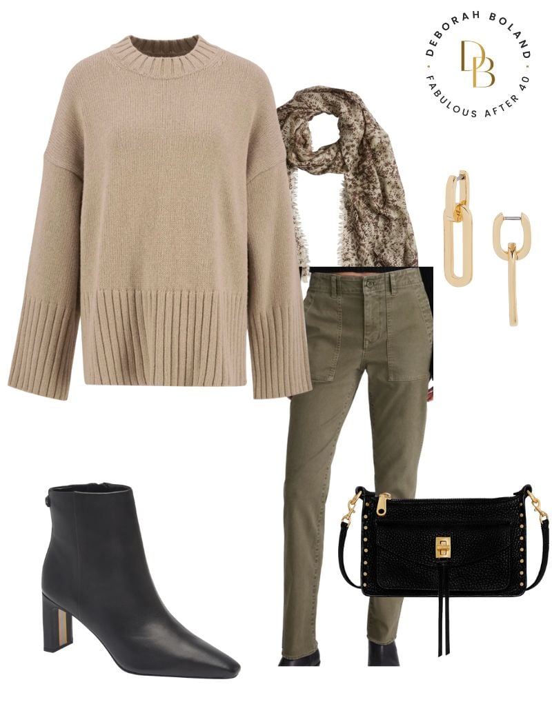 For those laid-back Fall days when you still want to look cute but feel comfy, this outfit is my go-to. Start with a pair of gray twill cargo pants—something with a clean cut and minimal detailing. Add a classic cashmere sweater and a scarf. You can always slip on a blazer, too.