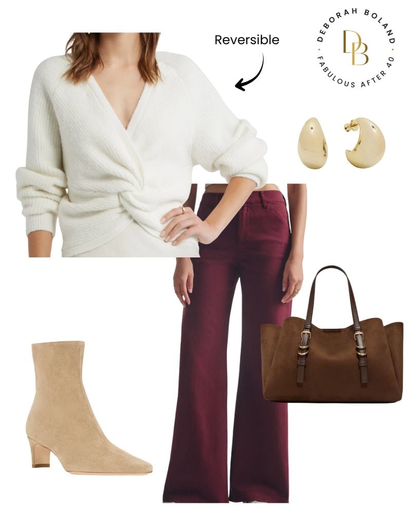 Style Tip: Keep your accessories rich and luxurious, like this chic suede tote and these classy gold earrings. Brown and cranberry are such a modern mix. This would be a gorgeous look for Thanksgiving and the holiday season!