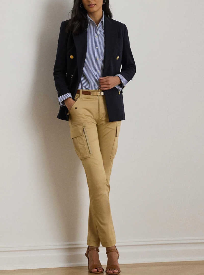 The easiest way to uplevel casual cargo is with tailored pieces. Pair a crisp, tailored button-up shirt and a double-breasted navy blazer with these slim, chic cargo pants. Add some heft to a dressier look.