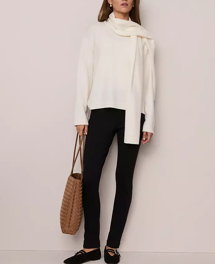 Outfit 1:Black ponte pants | white or heather sweater | woven bag | mary janes