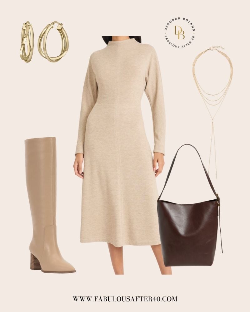 funnel neck sweaterdress | boots | bag | necklace | earrings