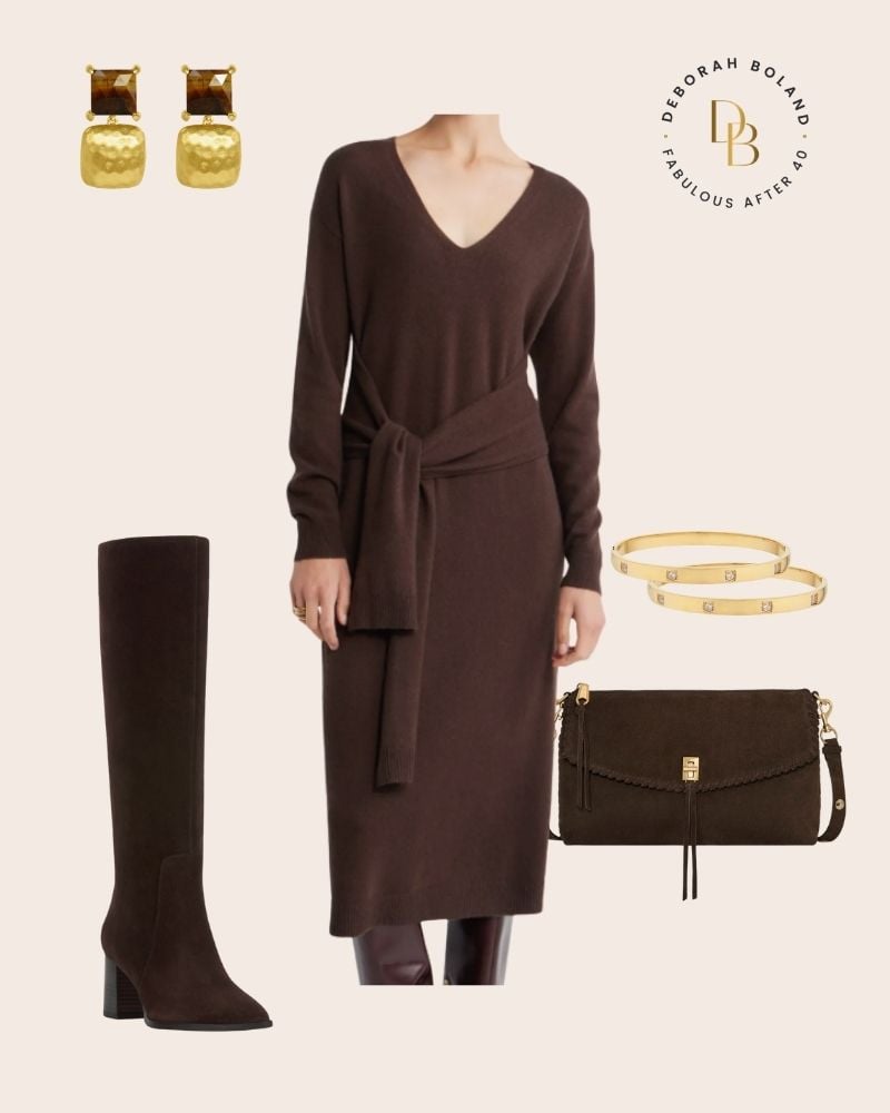 Take this chocolate brown sweater dress, for example. It’s loosely belted at the waist in a way that feels unstructured and chic—nothing stiff or overly done. The rich brown shade feels warmer and more on-trend than your usual black, and when you pair it with tall brown suede boots and a suede bag, the whole look takes on this earthy, elegant vibe that’s both luxe and easygoing.