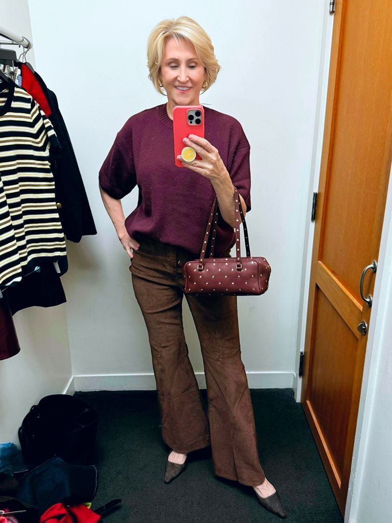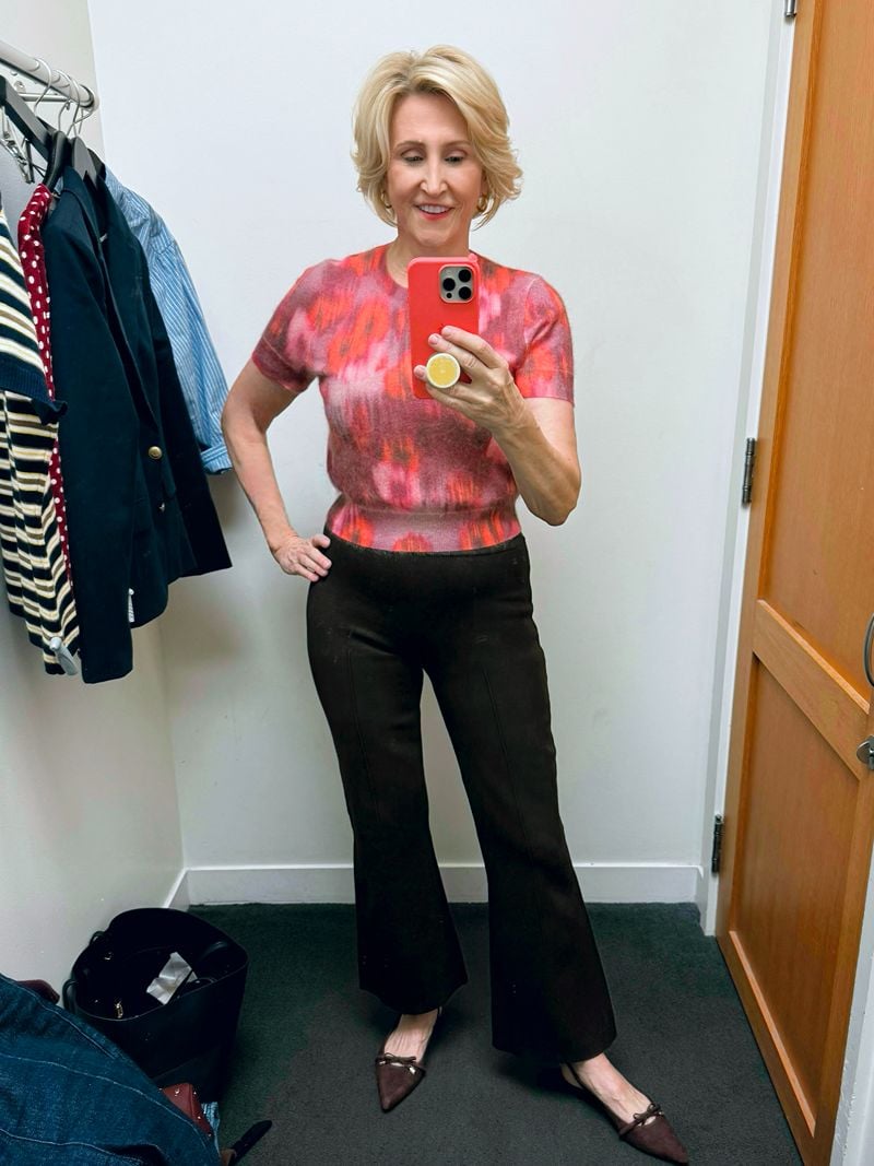 The soft, washed pinks and reds, with a touch of brown, are beautiful and right on trend. But honestly? I don’t love this sweater with these knit pants. Tight sweater, tight pants—it just feels too much, and trying to match the brown in the pants to the brown in the sweater makes it look dated. I think it would be way cuter with medium-wash straight legs or some wide-leg jeans. Live and learn—that’s why we do try-ons.