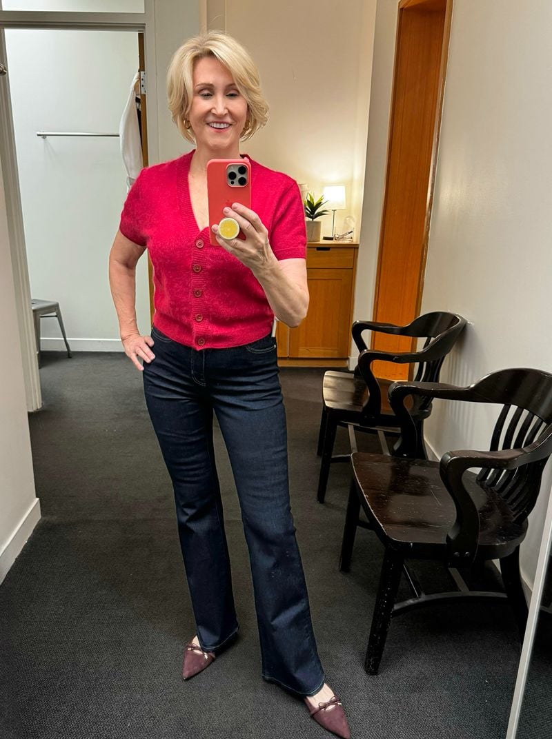 And the Winterberry red? Gorgeous. (I flagged this new color in my Fall Colors Report.) It’s so juicy, I skipped right past light-wash denim and paired it with a dark resin rinse boot cut. The way that deep wash sets off the red is just so elegant.