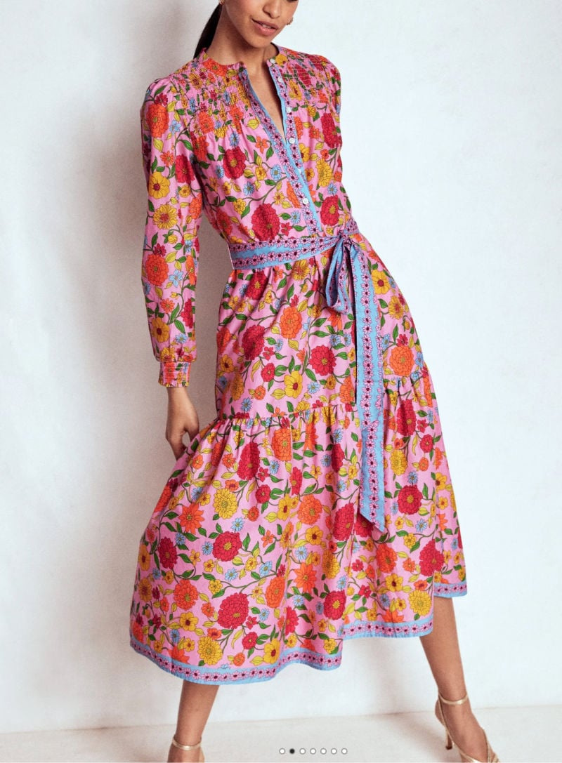This midi dress is a floral option that doesn’t feel too precious. The ruching defines the waist, and the longer length adds elegance without trying too hard. Great for a daytime wedding when you want to look feminine, not frilly.