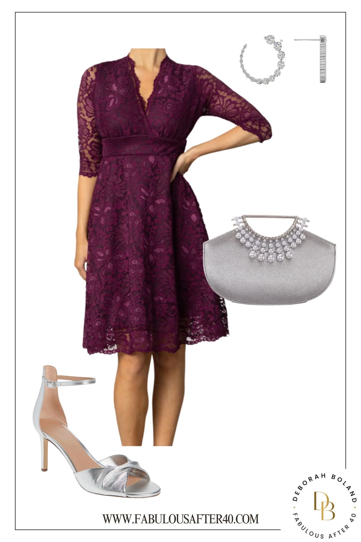 Silver is trending this season, and what better way to wear it than with a dress this color? The icy shoes, bag, and earrings add a glamorous modern touch.