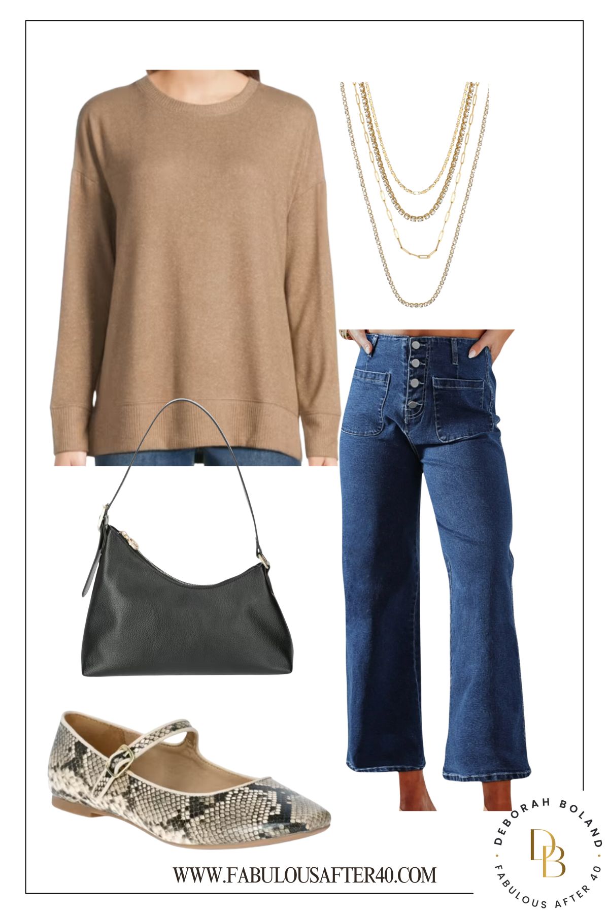 These button-front patch pocket wide-leg jeans are as comfortable as they are chic. A slightly oversized, drop-shoulder sweatshirt makes the look casual, and a pair of cute snake print Mary Janes give your feet the comfort they’ve been craving.