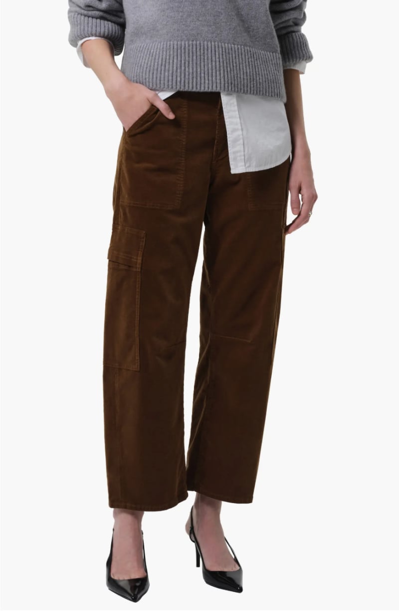 Sometimes you need a go-to outfit that feels polished but not fussy—and this one checks all the boxes. Start with a pair of fashion-forward barrel corduroy cargo pants in a darker neutral, such as navy, charcoal, or this chocolate brown. Add a crisp button-up shirt layered under a soft crewneck sweater (let the collar and shirttail peek out for a preppy touch). You can also finish with a trench coat or wool wrap coat if it’s chilly.