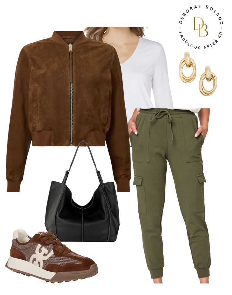 When the weather turns crisp, I love reaching for soft, warm pants that feel relaxed and loungey. These cozy olive loungers are ice and casual, but don’t look sloppy. Wear it with a suede bomber jacket for a sporty look. Wore a big, sloppy outfit and some trendy, colored sneakers (these are a combination of fabric and leather). You’re free for a coffee date, errands, or a cozy lunch with friends.